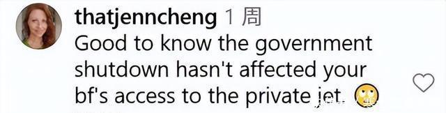 (截图来自Ins@alexiswilkins的评论区) “很高兴看到政府停摆并没有影响你男朋友使用私人飞机。失望摇头。”