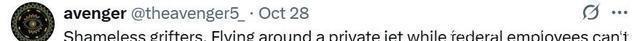 (截图来自Ins@alexiswilkins的评论区) “无耻的骗子!他们自己坐着私人飞机到处飞,而联邦雇员却领不到工资,很多家庭还在食品救济站排队呢。”