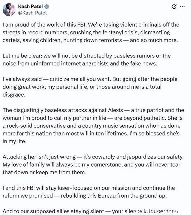 (截图来自X@AlexisWilkins的评论区) 11月3日,帕特尔在X上发了一篇小作文,回应最近的丑闻,否认对他的指控,态度非常强硬。 他在声明中说:“ 我们不会被毫无根据的谣言、不明真相的网络无政府主义者的呼喊以及假新闻所干扰。 ” “我一直都说——你们可以随便批评我。但攻击那些做出杰出贡献的人、我的私人生活或我身边的人,是极其可耻的。” 他还替女友回怼网友。 “针对亚历克西斯的毫无根据的攻击——她是一位真正的爱国者,也是我引以为傲的人生伴侣——那些攻击简直令人作呕。” “她是一位坚定的保守派,也是一位乡村音乐明星, 她为这个国家做出的贡献,远超大多数人十辈子的贡献。 我非常幸运,生命中能有她。”