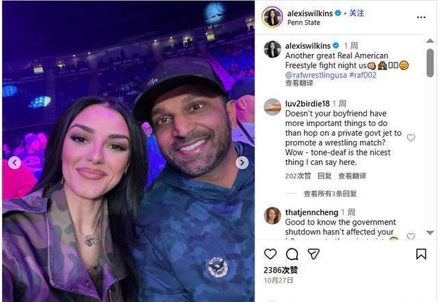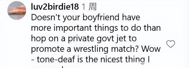 (截图来自Ins@alexiswilkins的评论区) “你男友就没有比坐私人飞机去给摔跤比赛捧场更重要的事做了吗?哇,我只能说他太没同理心了。”